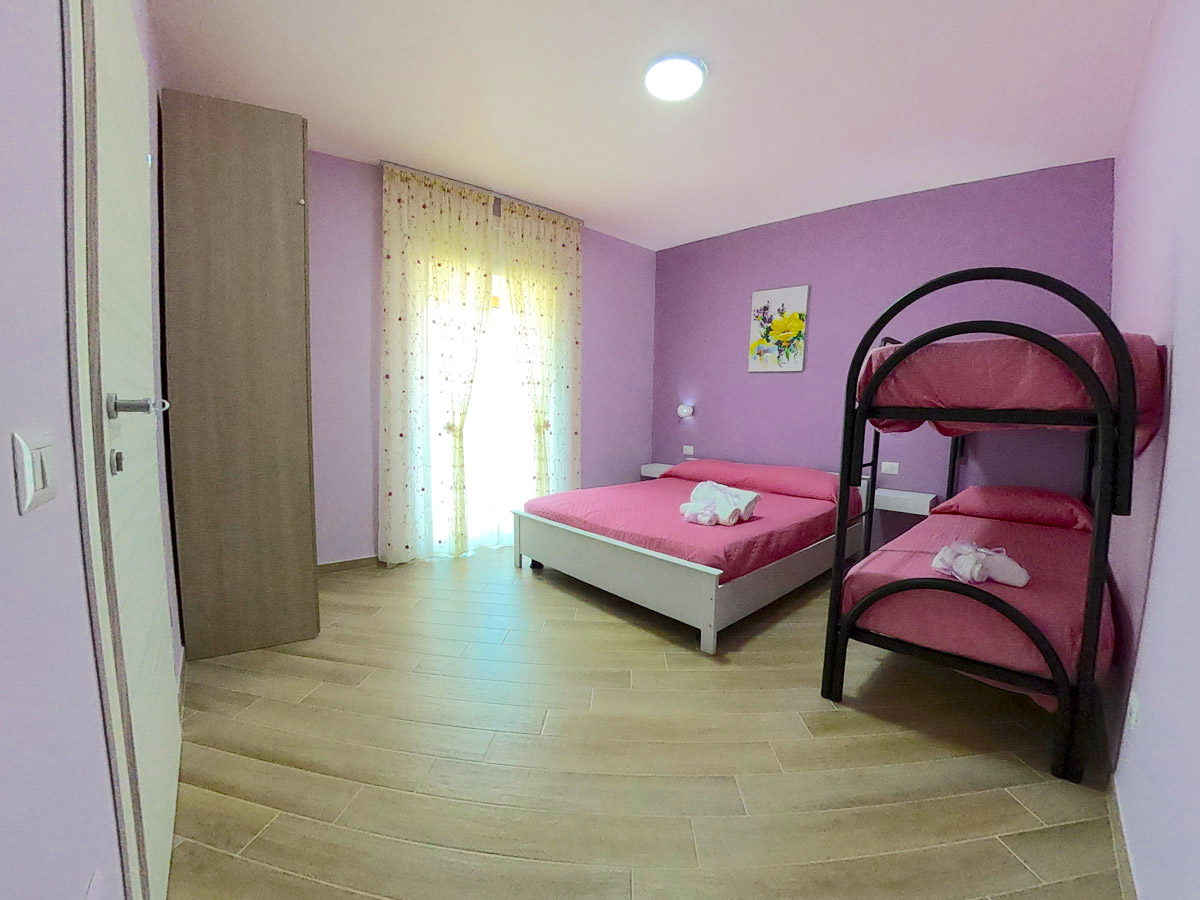 Camera quadrupla: letto matrimoniale, 2 letti a castello, possibilità quinto letto, comodini, guardaroba, bagno privato
