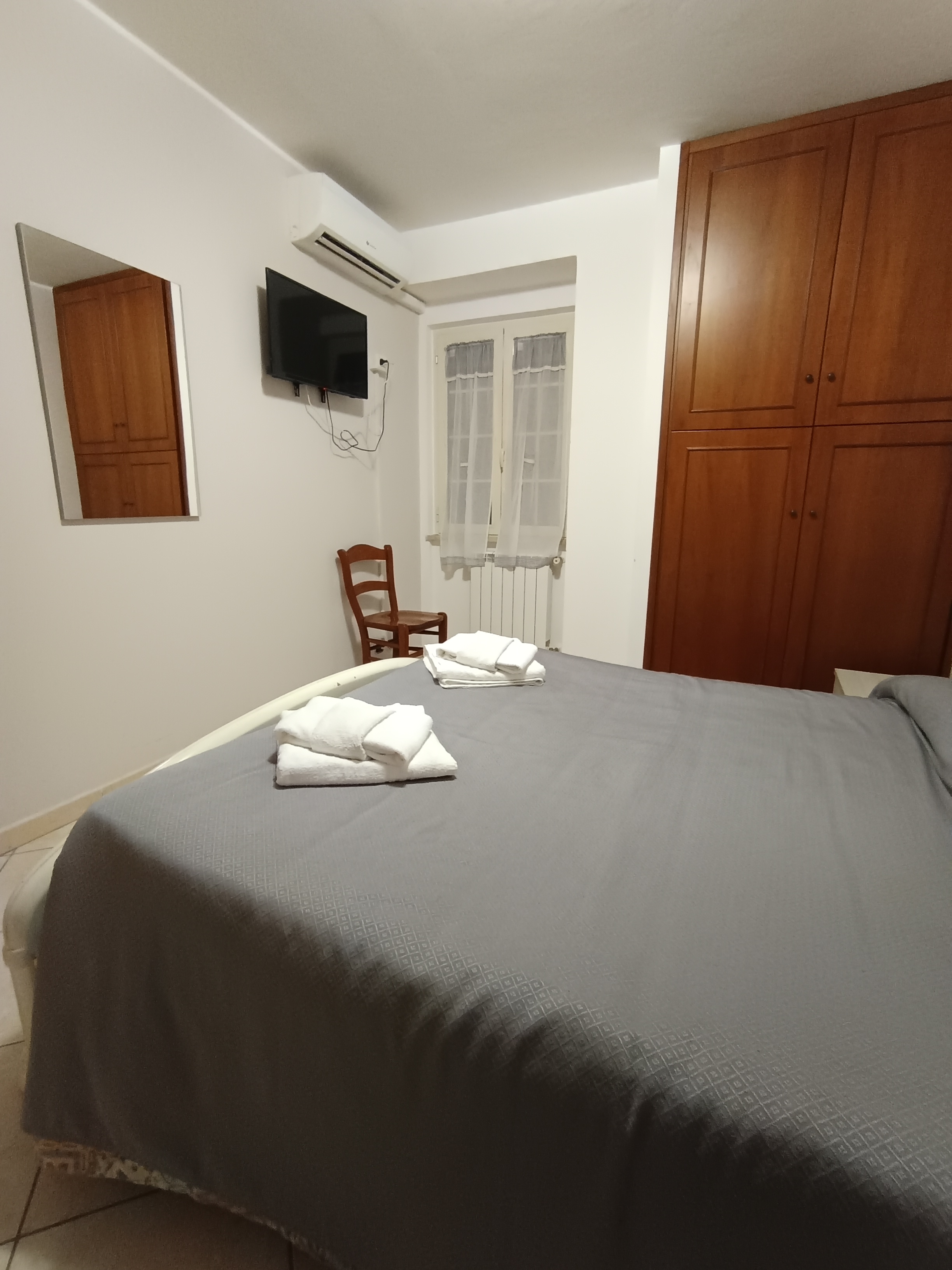 I Camera matrimoniale: Letto matrimoniale, biancheria, comodini, guardaroba, climatizzatore, TV.