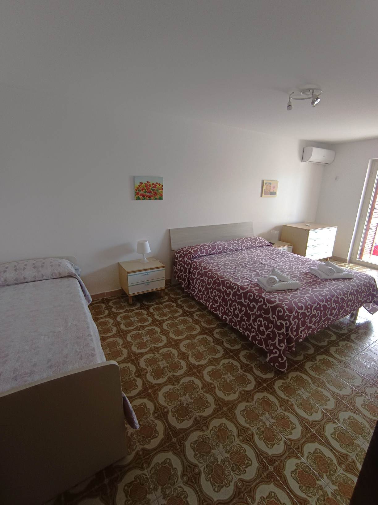 Camera matrimoniale : Letto matrimoniale, lettino supplementare, biancheria, comodini, guardaroba, climatizzatore, TV.